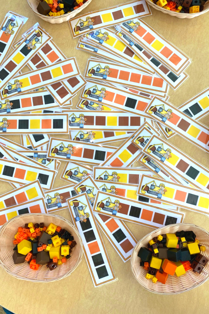 Have kids build and complete the patterns with the blocks. Using a variety of sizes and textures is great for an added sensory element. Smaller connecting blocks are perfect for advanced fine motor.