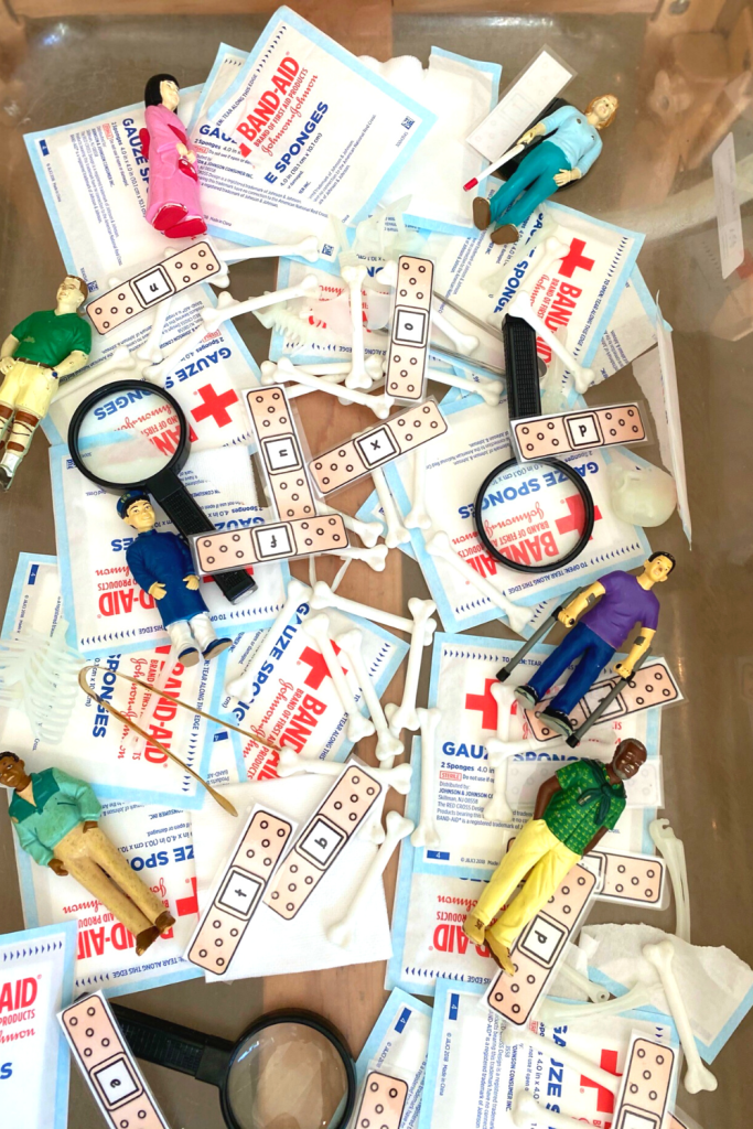 Add all of your materials to your sensory bin, and have your kiddos bandage and treat the dolls.