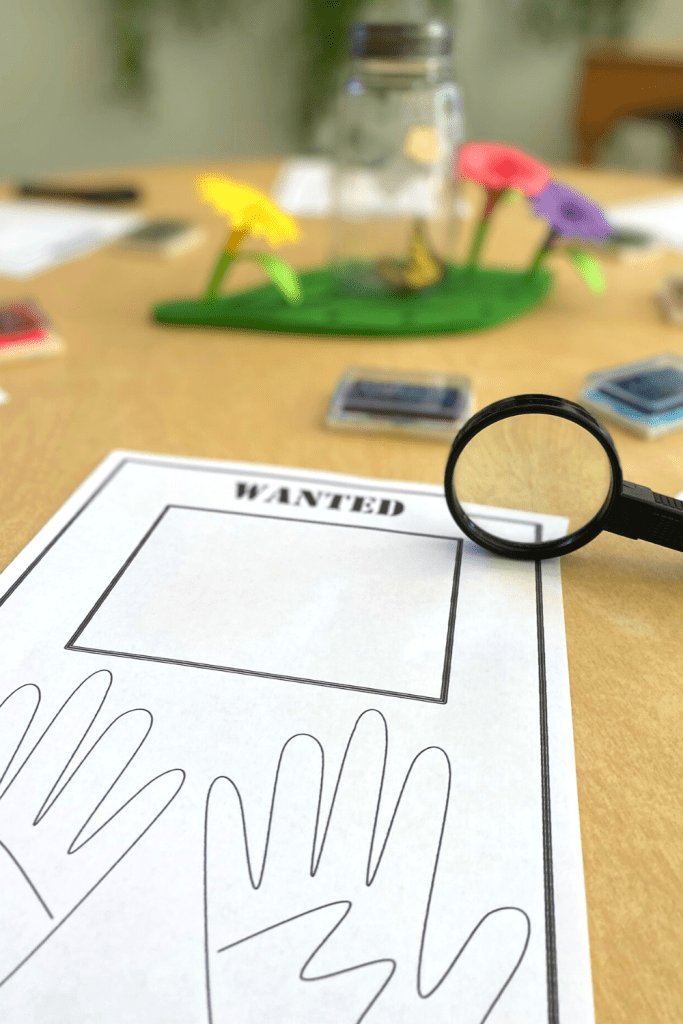 A student of mine had caught this enormous and beautiful butterfly and wanted to bring it to school. So I decided to add it into our theme and have them be detectives to find out who captured the butterfly. (This butterfly was already dead when she found it and no butterflies were harmed in the process ❤ ) Have the kids use the ink pad to take their fingerprints and apply them to the correct fingers on the page. Once they have finished, have them draw a self portrait in the box provided.