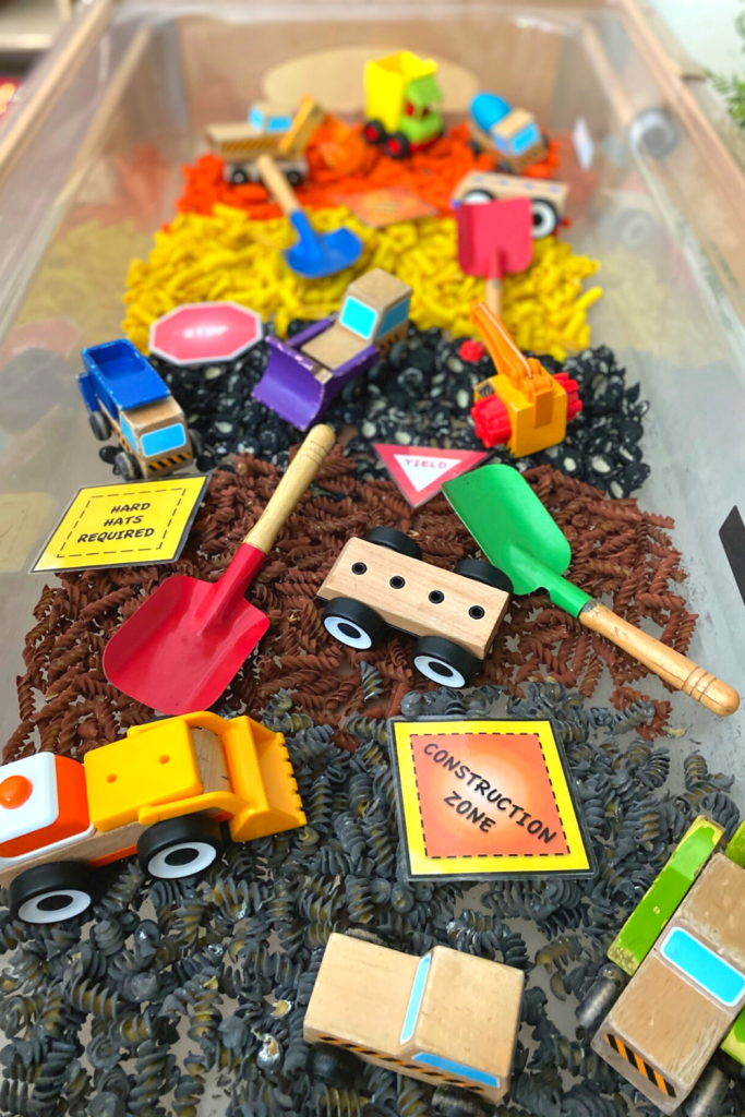 Have kids scoop, pour, and mix the pasta with the trucks and their hands.