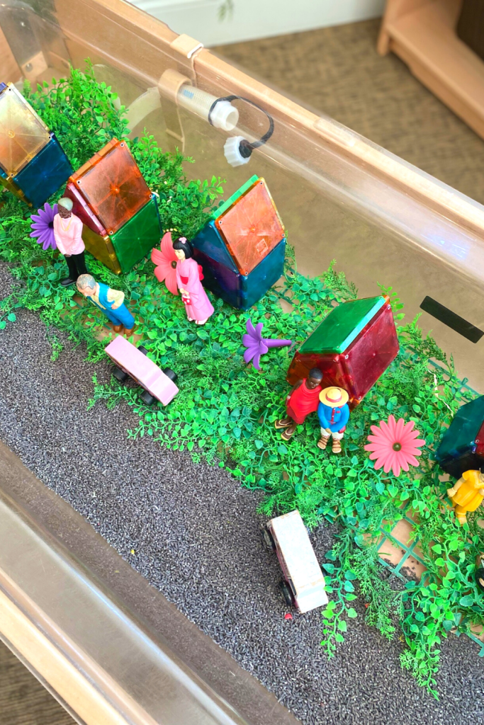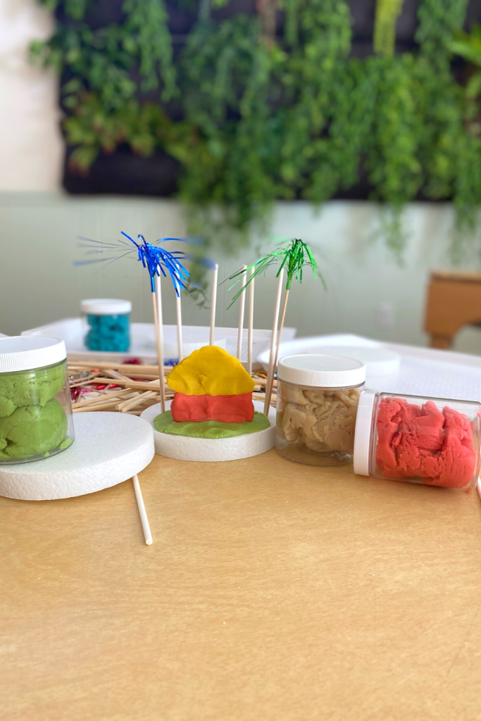 Any craft materials would work here. I used lollipop sticks, tinsel toothpicks, and play dough. The kids used a styrofoam disc as the base, and built a home!