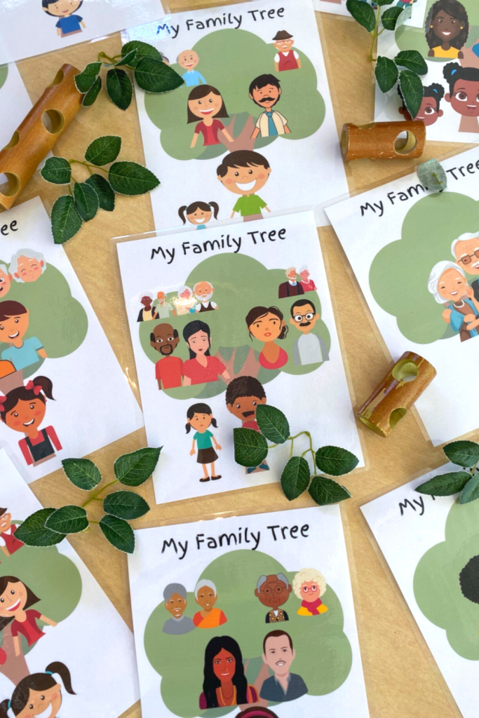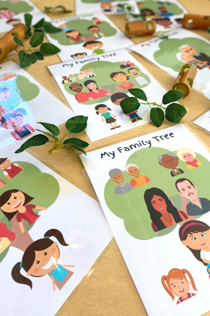 Add all of your materials to a sensory bin and have your kiddos create a family tree.