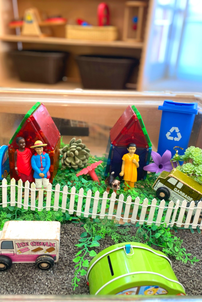 For this activity I printed and laminated 6 different looking houses. I then created family names, printed and laminated as well. I displayed a variety of dolls and had the kids pick a home. They then rolled the di and counted the number. The number they got was the amount of family members in their house. They randomly picked the family names and chose a doll for that member.