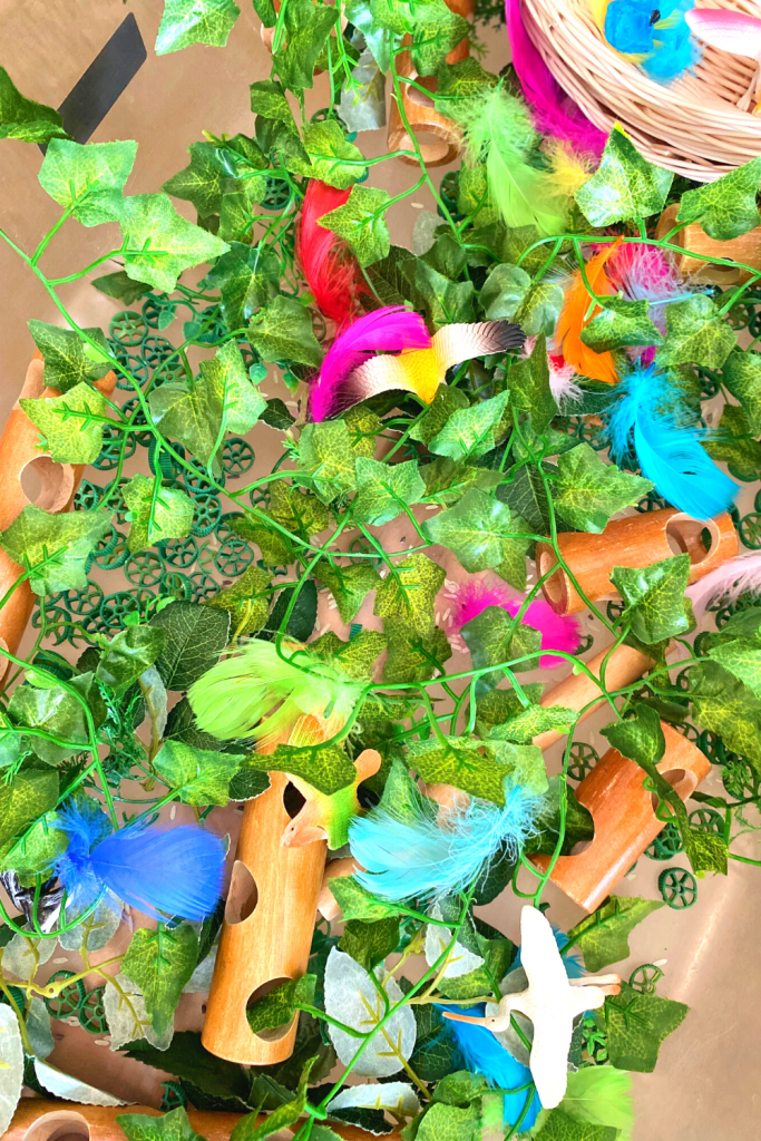 For this sensory bin I tried replicate the Amazon Rainforest with what I had available. I think it turned out really cute 😊.