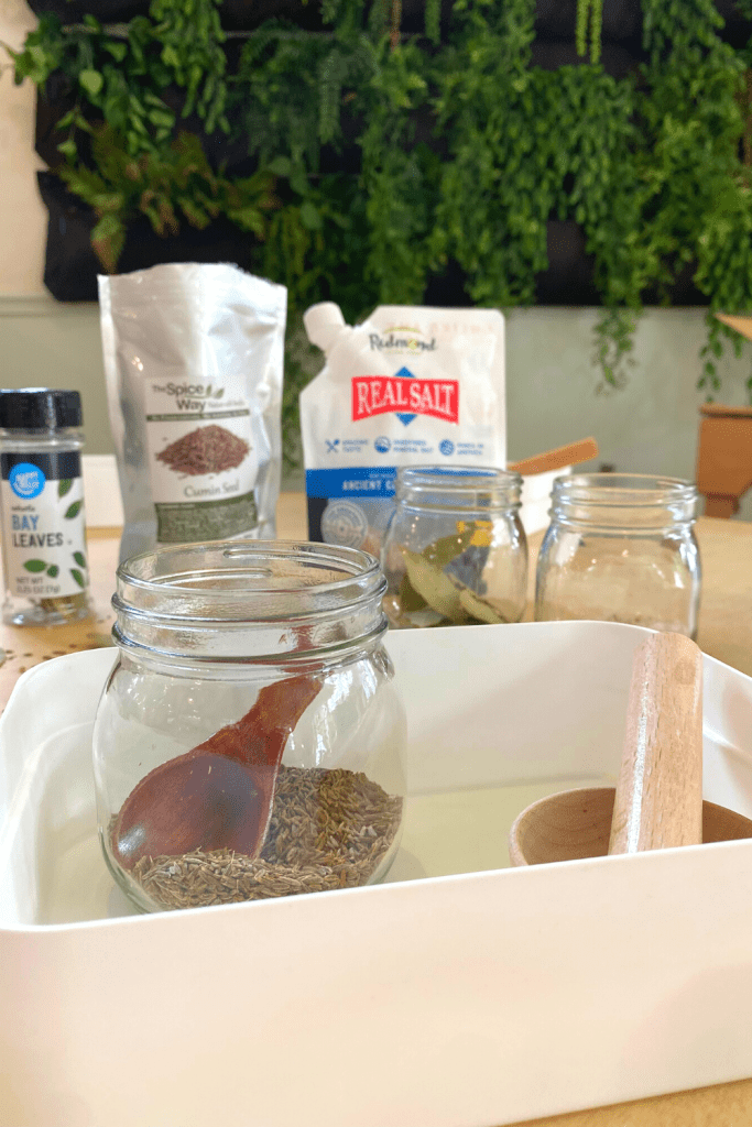 Add materials to the sensory bin and play!