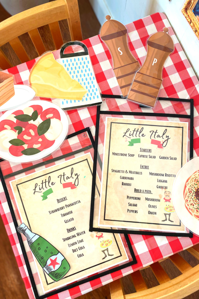 You ABSOLUTELY need this Italian food dramatic play area for your kids! This is hands down my FAVORITE one I’ve created, and I wanted to share it with all of you! It is so cute you and your kids will want to stay in this center forever. This can be used for dramatic play at home, or in the class.