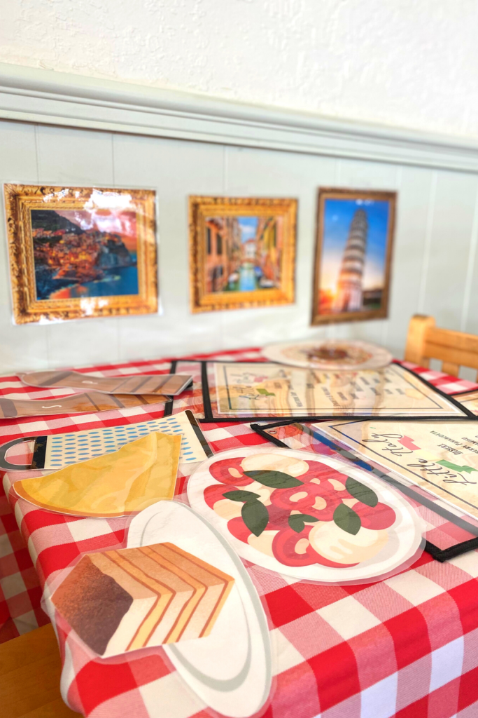 The theme was around the world week and I already had this activity from last year, however my mind ALWAYS wants to create something new! So I turned it into an entire Italian food set up! From the framed pictures to the Carbonara, you will feel like you’re in Italy!