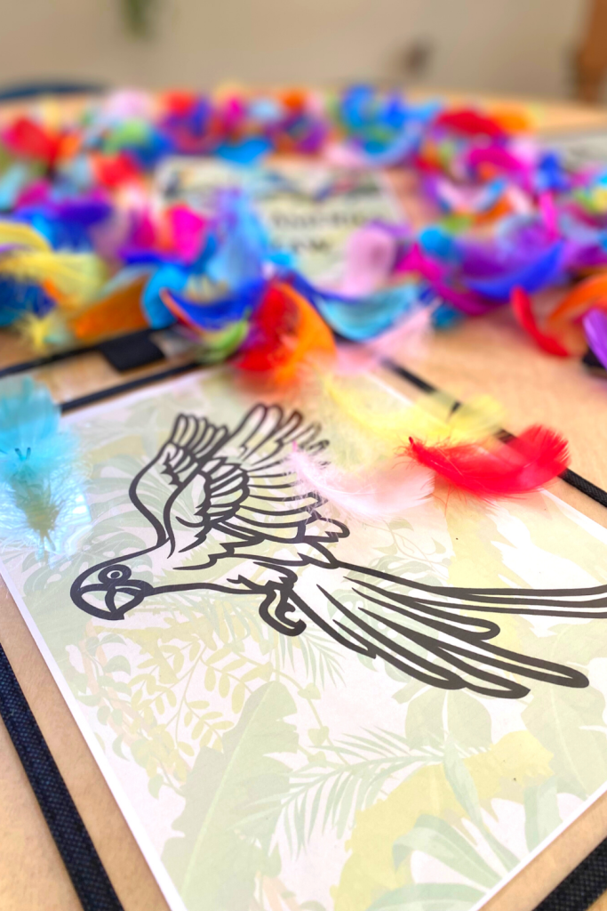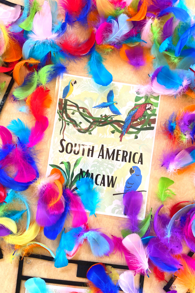 The South America Macaw are native to the tropical North and south America. Laminate your template or place inside of a pocket pouch ( I got these from Amazon). Have kids add their feathers to their template to decorate their Macaw. Towards the end of the activity we through all of the feathers in the air and watched them fall slowly.