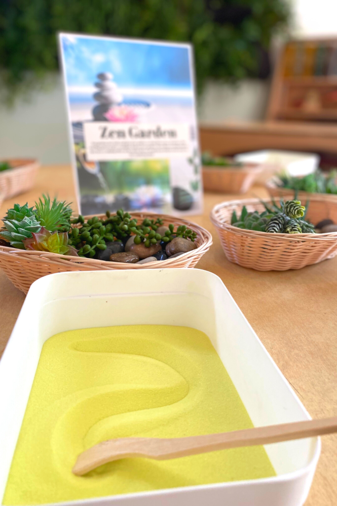 Zen rock gardens originated in medieval Japan and symbolize simplicity and serenity. Add some sand into a tray and place a basket of add-ins close by. Have kids rake the and and stack stones to build a zen garden. I also play some calming music 👌🏻.