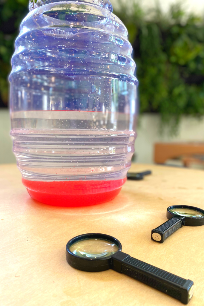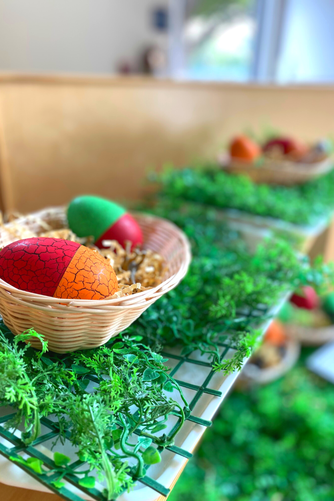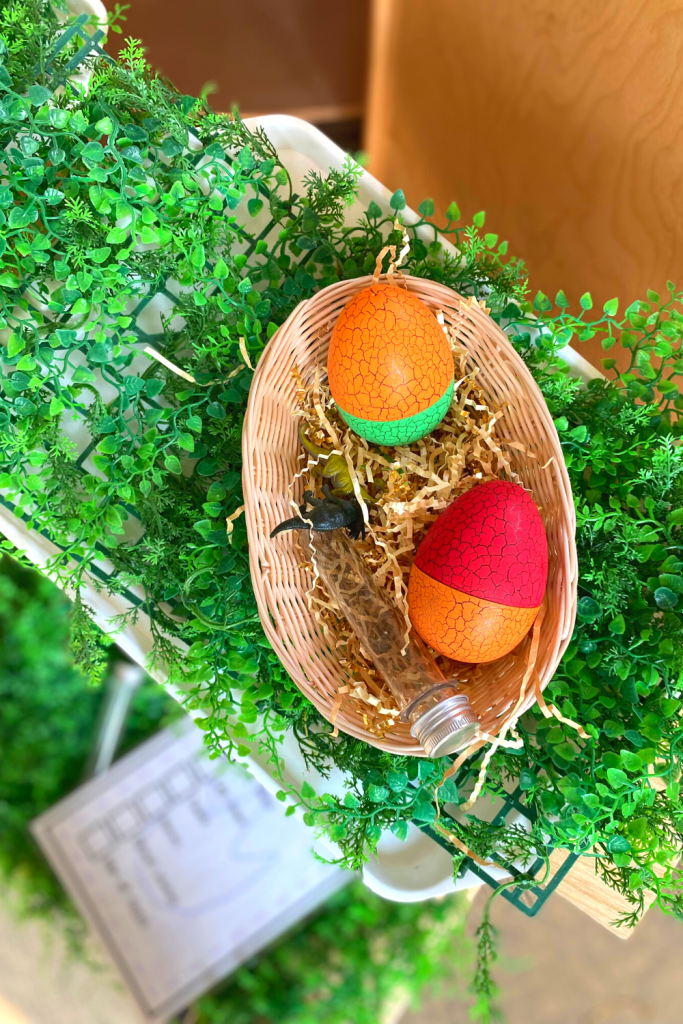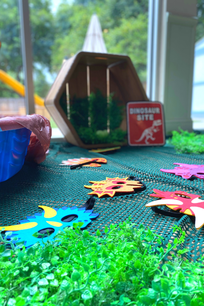 Prepare your water beads by allowing them to sit in the water for at least 3-4 hours before the activity. The longer the better 👌🏻. (Water beads are at the beginning of the process in the pictures shown) Toss your mini dino and other objects inside. Have kids reach in and try to find the dinosaur! They can close their eyes for more of a challenge.