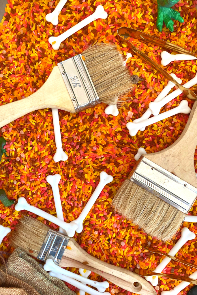 Typically I use flour as my filler so they can dust the bones, however I was out 🤭. Sometimes you’ve just gotta go with what you have 🤷🏼♀️. I used my fall rice mixture as the filler and added all other materials to the sensory bin. The kids still loved it of course!
