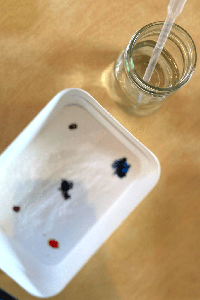 Add a layer of baking soda to a dish, and then drop various colors of food coloring all around. Cover with another layer of baking soda. Have kids use a pipette to drop vinegar onto the baking soda and watch the colors emerge.