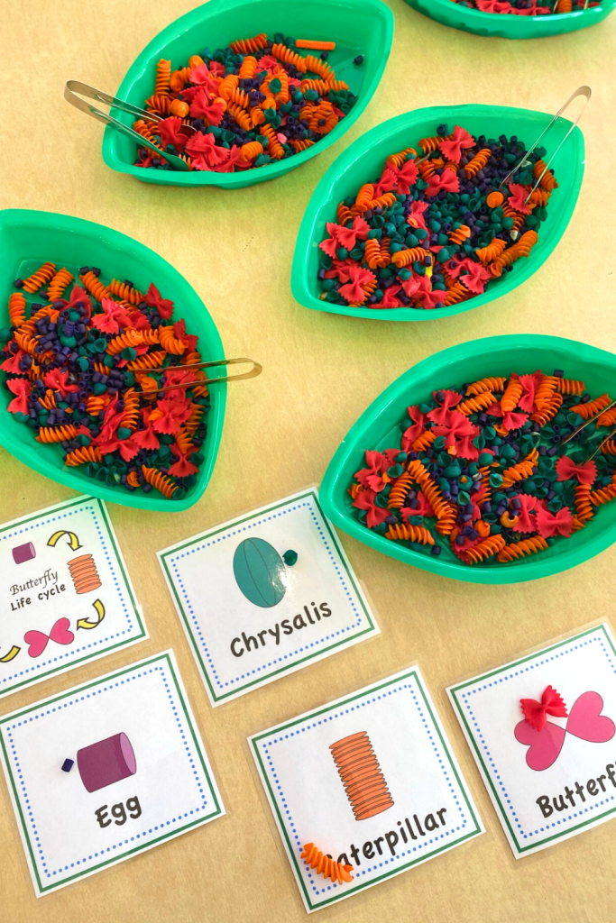 Full assembly directions can be found in the life cycle sorting cards download. Color your pasta, mix when fully dried, and sort your steps as you discuss the butterfly life cycle.