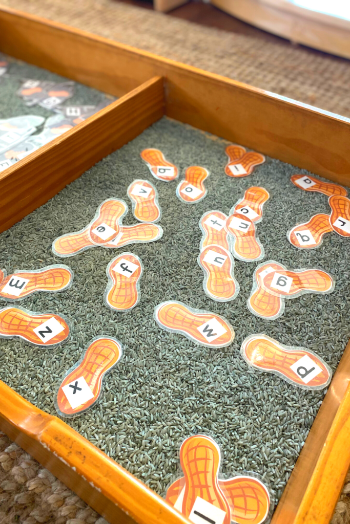 - Add one set of the alphabet to a sensory bin and lay the other on a table or the floor, dig through the sensory bin to match them!