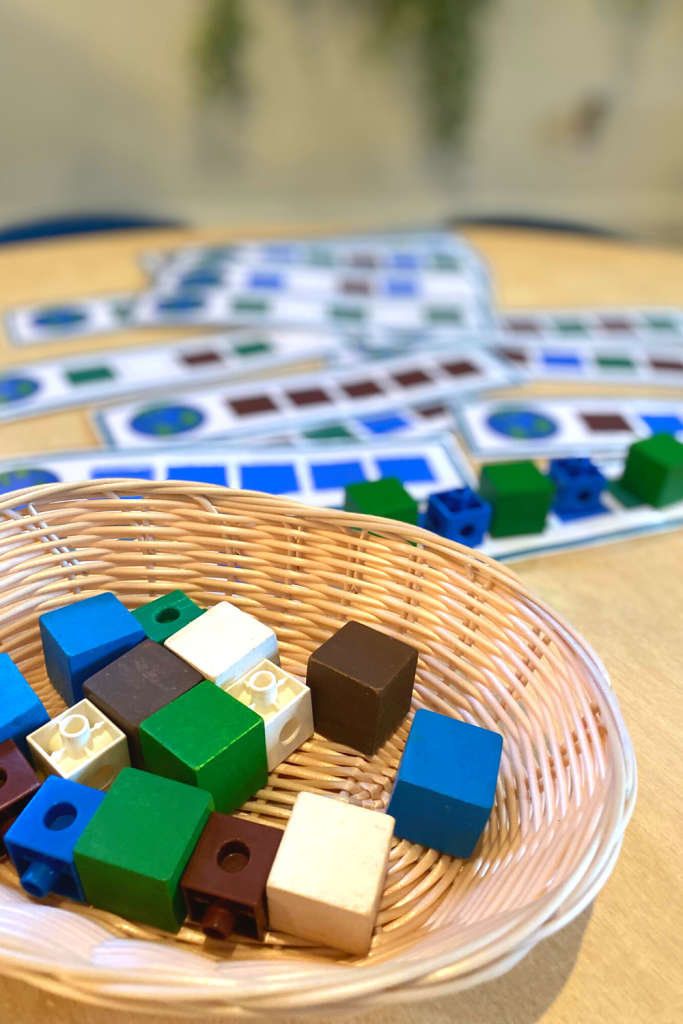 Use any type of block or object that corresponds with the colors of the patterns. In this set there are 24 cards total with a variety of patterns: A, AB, ABC