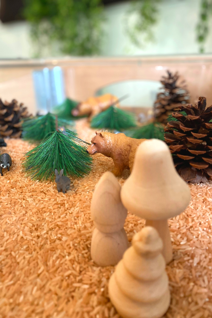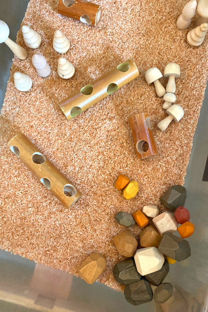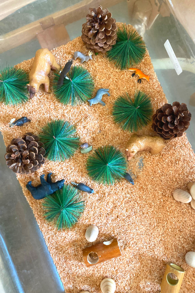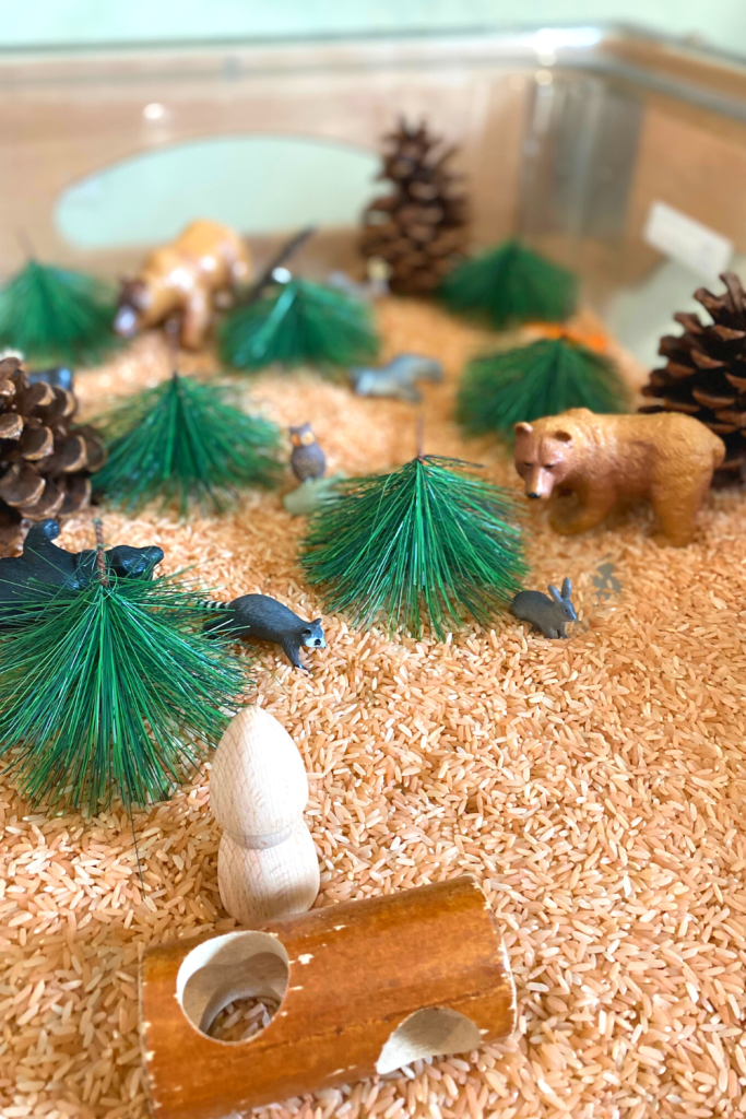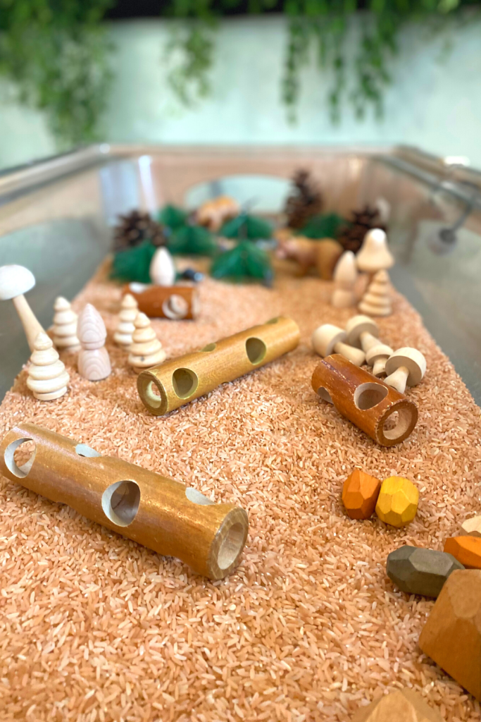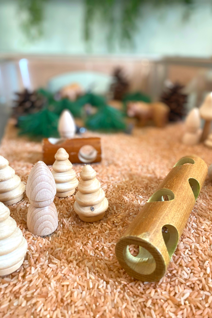 This is a great sensory bin to incorporate into a camping theme as well. Super easy to put together and the kids love to watch and listen to the rice fall through the logs.