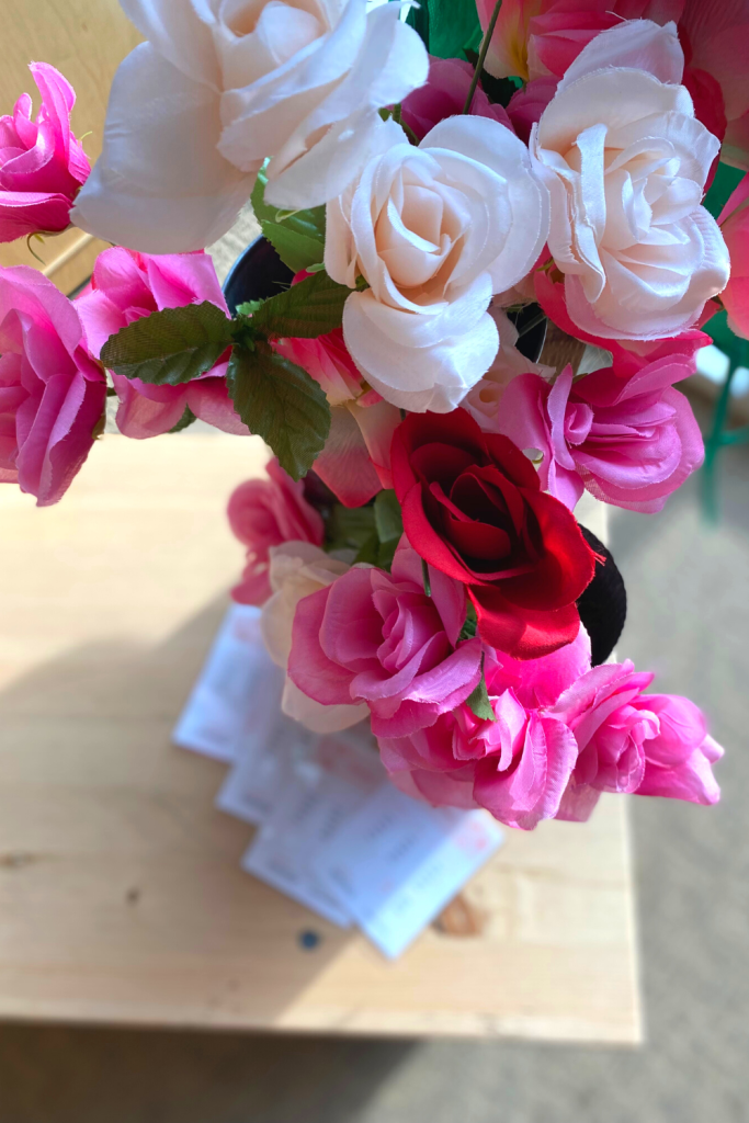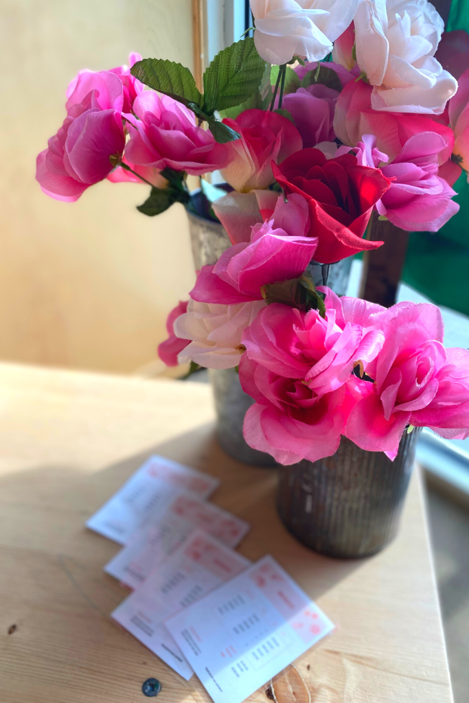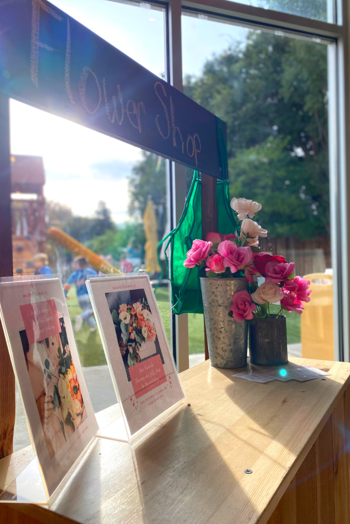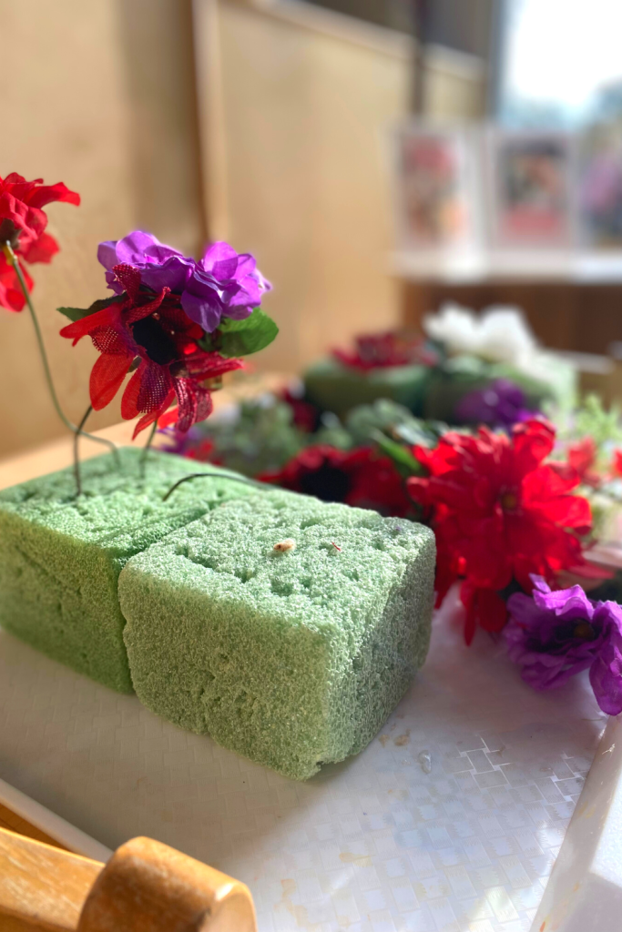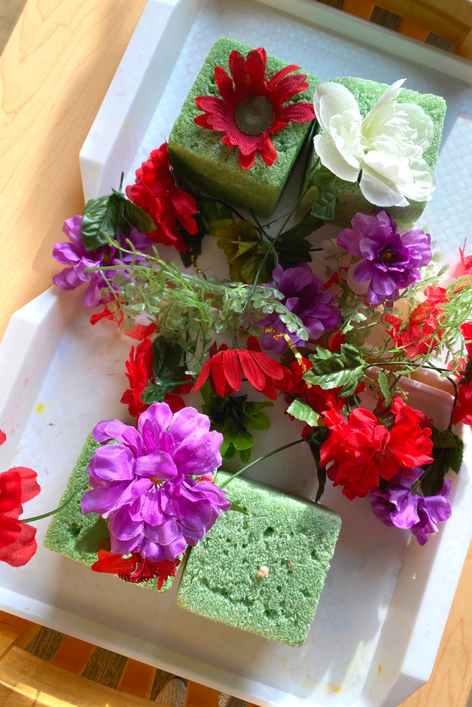 From the dollar tree I grabbed some flowers and a foam block so the kids can create their own arrangements. Great for fine motor!
