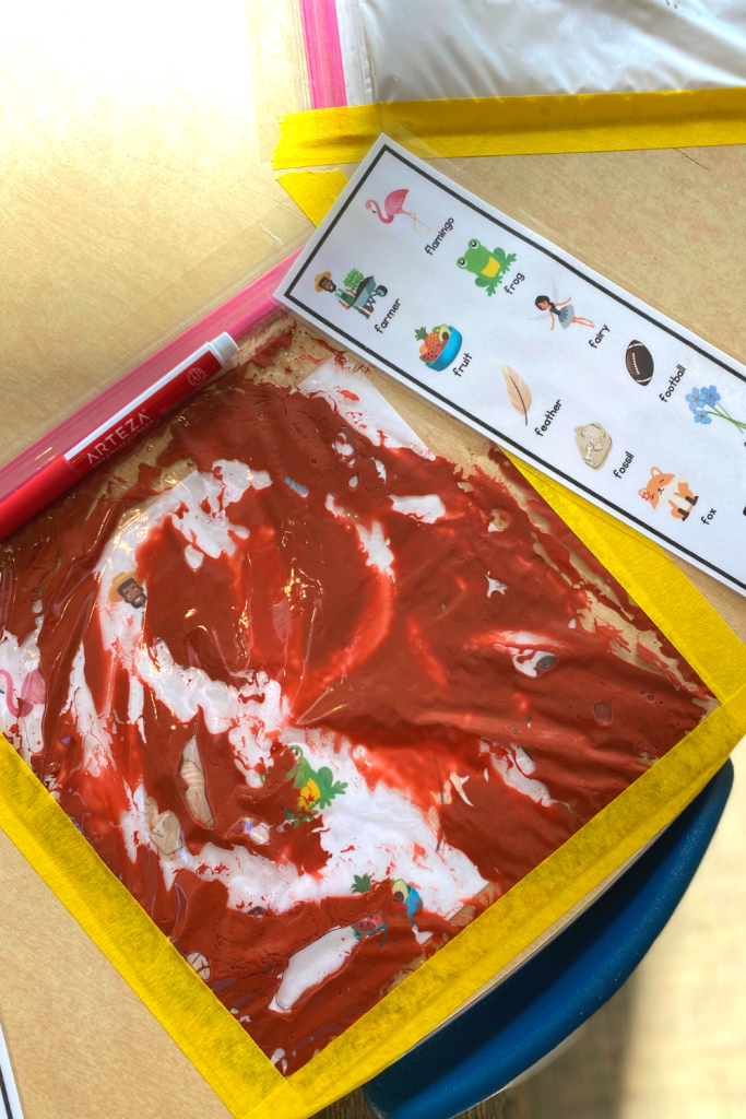 - To a large ziploc add your filler: Paint, shaving cream, water and food coloring etc.