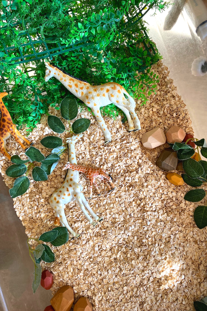 Not much to this sensory bin! I used oats as my filler and grabbed a few giraffes and leafs. Simple and they loved it!