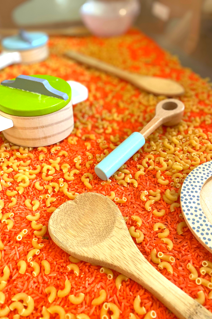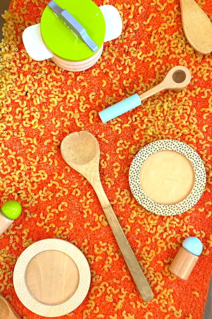Super easy set up for this one. I used orange rice as the base (cheese). I then added dried, plain macaroni noodles and some cooking tools. The kids pretended to make mac ‘n cheese. Yummy!