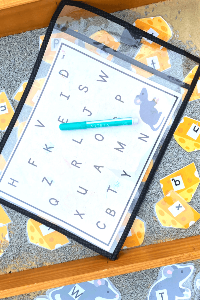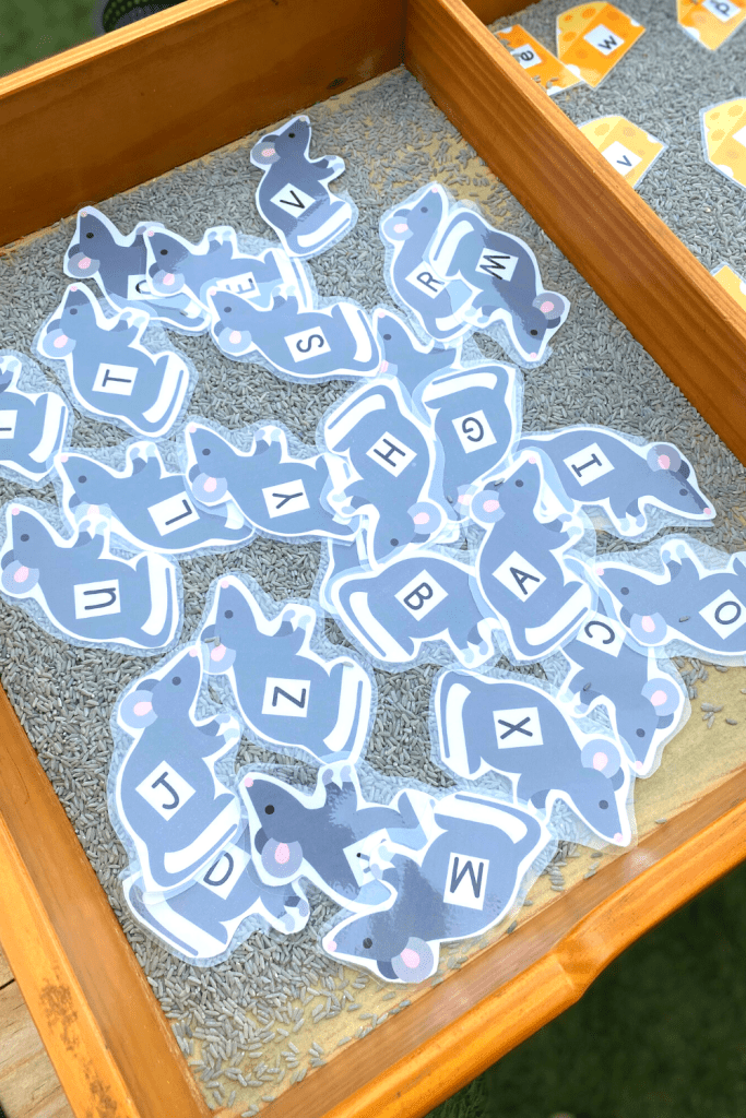 Here is our outdoor sensory this week! I used gray rice as the base, and added my set of mouse and cheese alphabet cards. You can find them here.