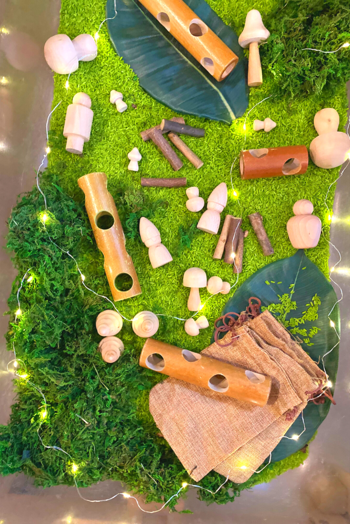 This one was SO beautiful. I just adore these little lights from Amazon! I used green rice as the base, and added some moss. Tossed in some wooden gnomes, trees and mushrooms as well as logs. Gave the kids burlap bags to fill, and then turned on the lights!