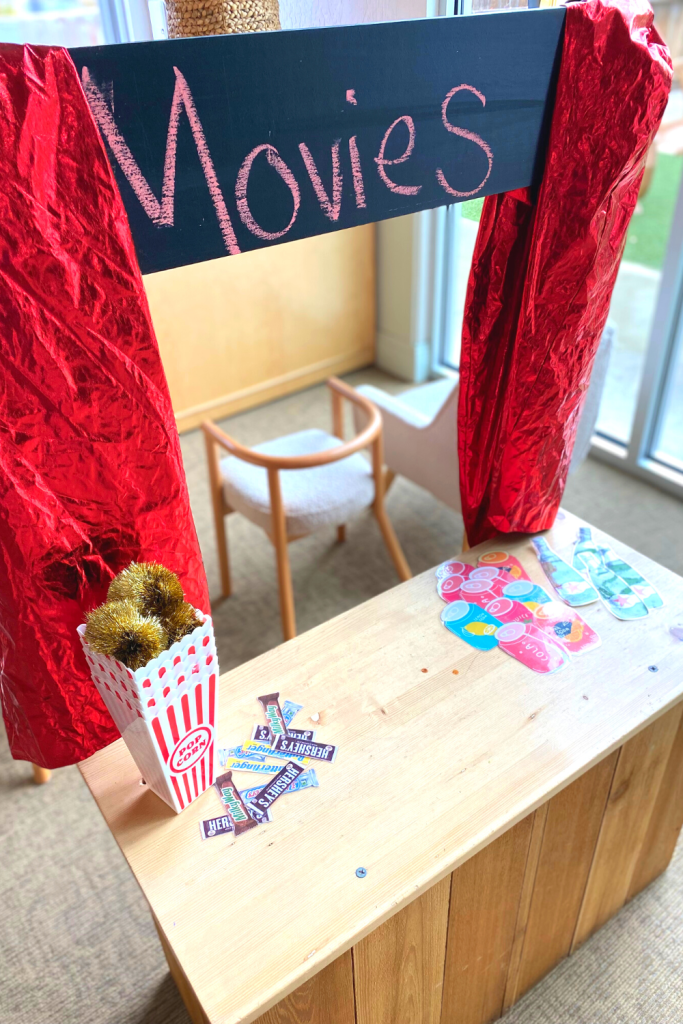How cute is this activity?! I added a variety of yellow pompoms to a bowl to replicate popcorn (although, you can use real popcorn if you would like). Next, I mixed in the polaroids; 6 sets so each child has their own. The kids took turns digging through the “popcorn” to find and match the correct image on their page.