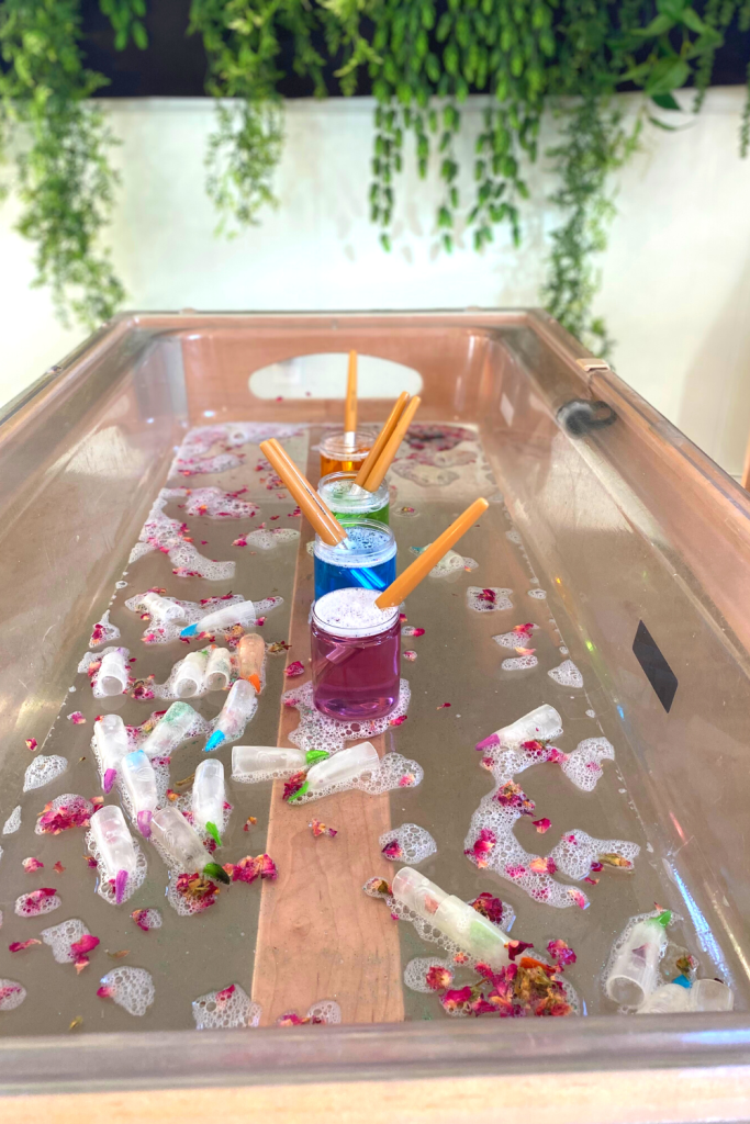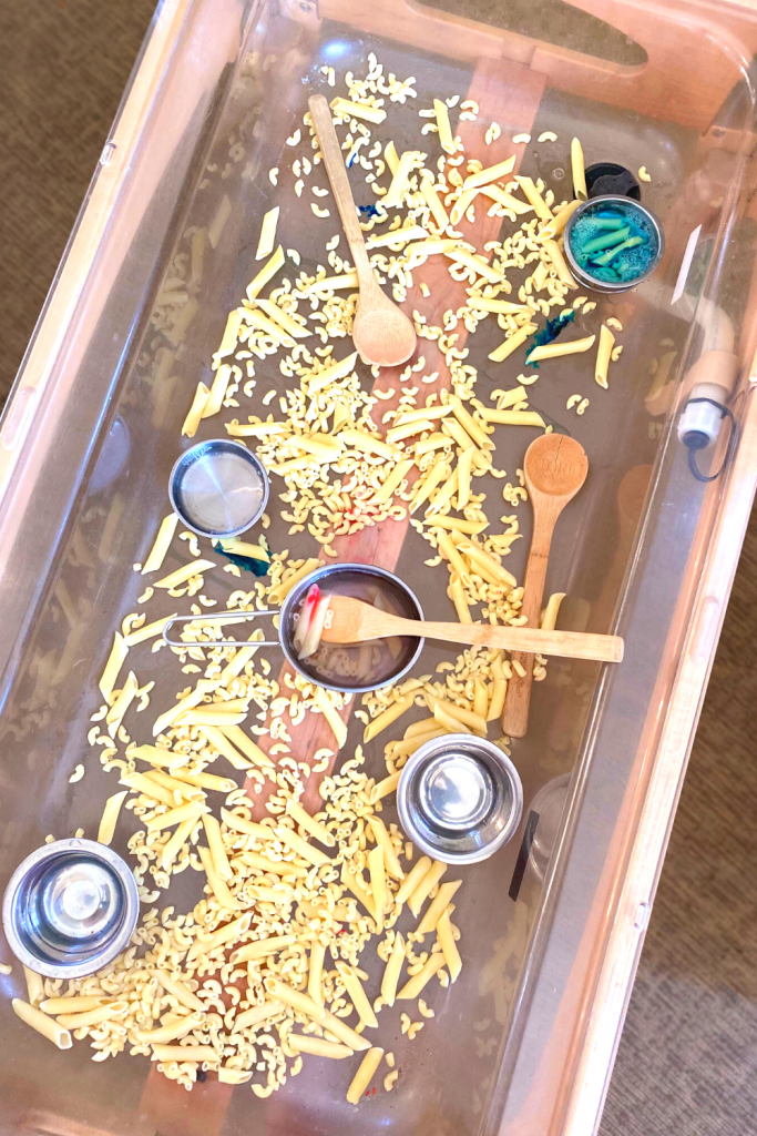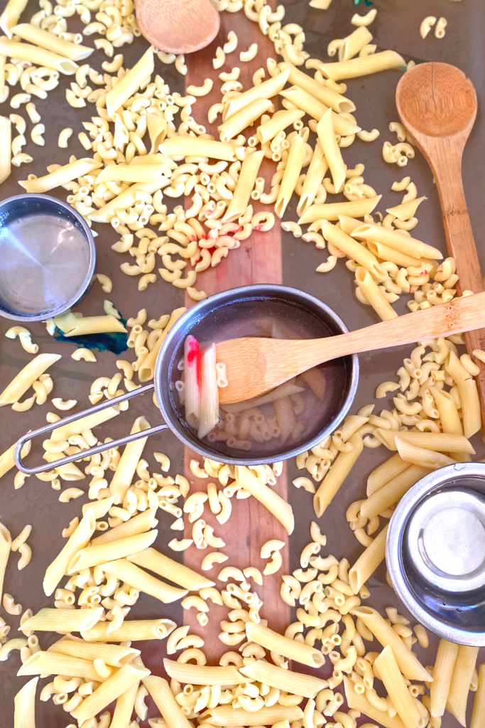 This was last minute sensory, and all I had were these pasta shapes. I cooked them up, and tossed them in a little but of oil so they didn’t stick together. Next I added some wooden spoons, drops of food coloring (with a drop of dish soap to prevent stains), and some pots and pans with water. The kids squeezed, mixed, ripped, and “cooked” the noodles.