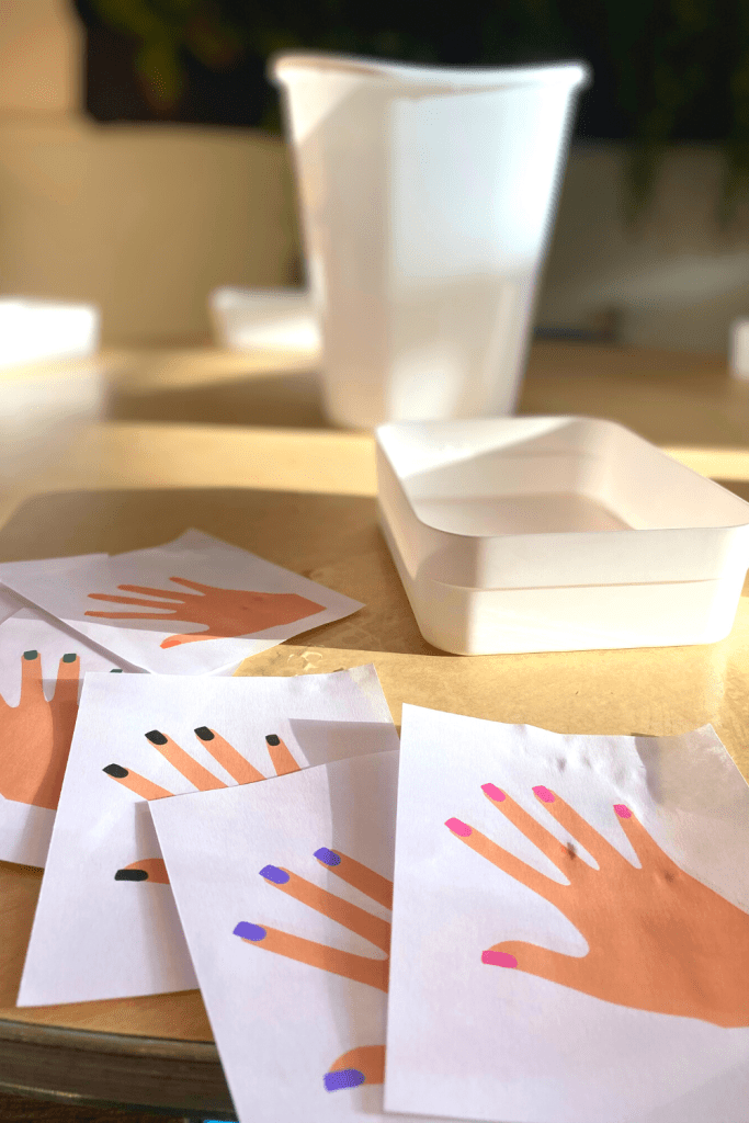 Sometimes I forget how much I love this activity. It does go pretty quickly, so I slow it down by only handing them a few papers at a time. One side of the paper has a hand with no nail polish and the other side has a hand with nail polish.