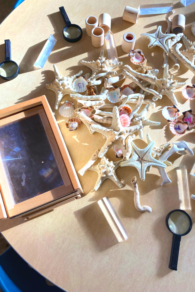 It’s safe to say…lately I like taking the easiest path possible ha ha. We have these sea stars and shells in the science area, so I decided to display them on the table with different tools to analyze and compare them. I don’t know why I’m always so shocked when the kids LOVE these last minute ideas.