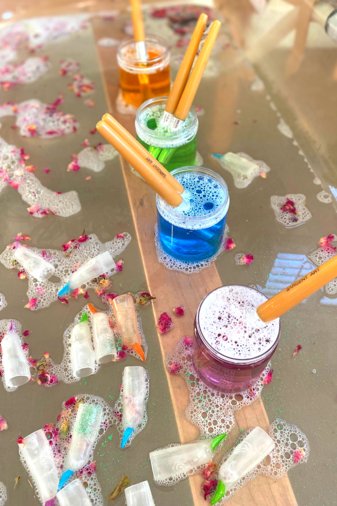 To a tray or dish with water, add the paper with the colored nails face down. Watch the color bleed through and the nails will change color!